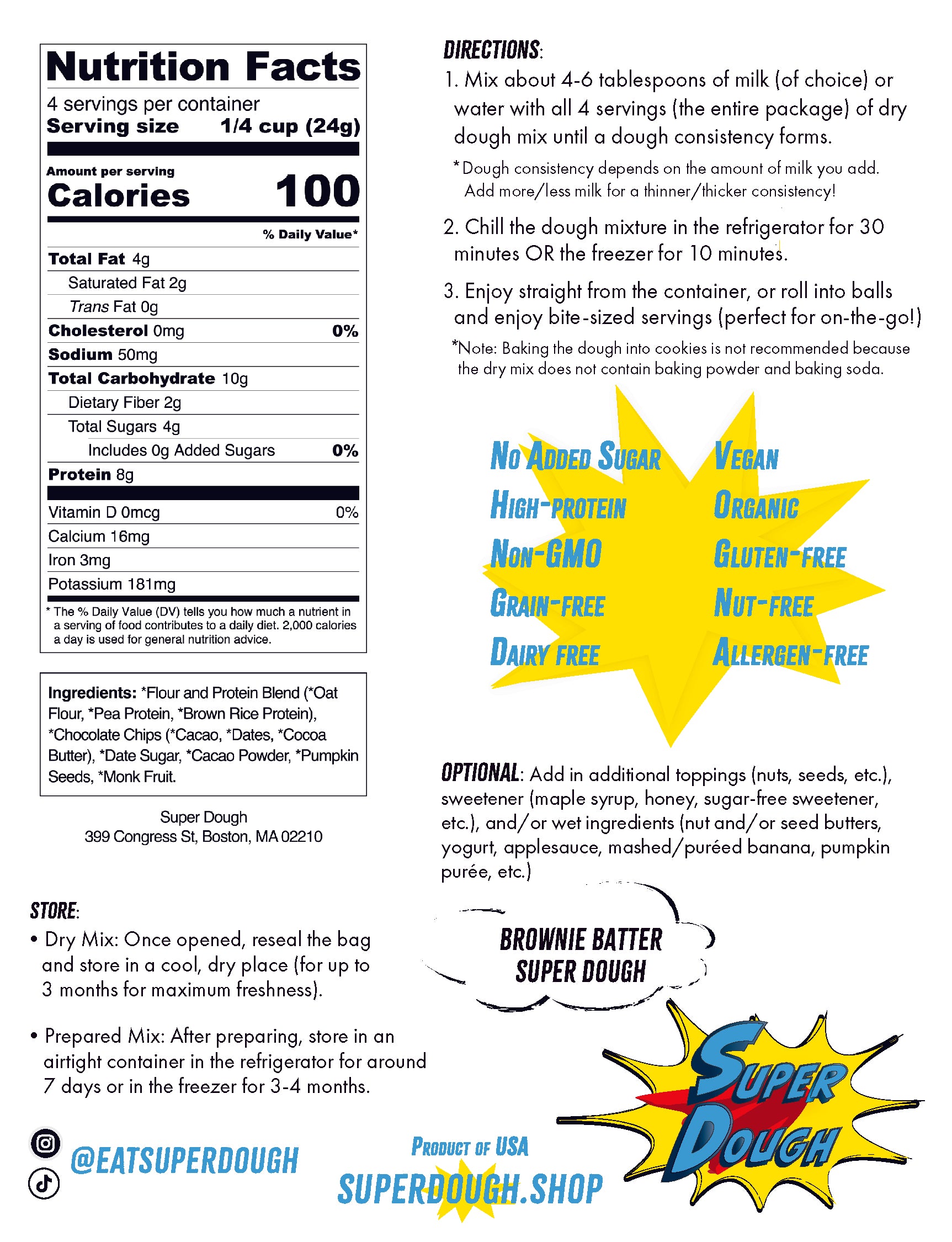 *Flour and Protein Blend, *Chocolate Chips, *Date Sugar, *Flaxseed, *Monk Fruit Extract, *Cinnamon